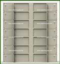 This solidly constructed double-width vault interior unit contains 14 teller lockers and is available in 16 different baked powder coat finishes. Units are of Integrated, uni-body, 18 gauge, double side wall construction. Units come standard with key locks but can also be furnished with combination locks, electronic locks, or any combination of the three. You can be confident in the quality of the construction of these units and they will give you years of service. The cabinets shown are in Champagne finish. Overall dimensions of the 17" deep unit: 32-1/2"W x 17"D x 35-7/16"H with interior locker compartment clearance of: 15-1/4"W x 15-3/4"D Overall dimensions of the 24" deep unit: 32-1/2"W x 24"D x 35-7/16"H with interior locker compartment clearance of: 15-1/4"W x 22-3/4"D