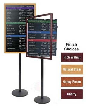 Swing-open wood floor frame for 22" x 36" rate displays or graphics. Comes with plunge lock. Choice of four finishes: rich walnut, natural clear, honey pecan and cherry. Dimensions: 13-1/2" base and 74" high.